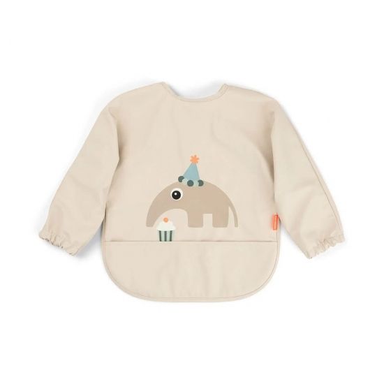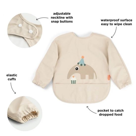 Su superficie impermeable garantiza que la ropa se mantenga limpia y se limpia sin esfuerzo después de las comidas sucias. Cuando necesite una limpieza a fondo, basta con lavarlo a máquina a 30 °C y estará listo de nuevo. El bolsillo incorporado recoge la comida que se cae, minimizando el desorden. Con un práctico cierre de velcro, vestir a tu hijo es fácil y rápido.