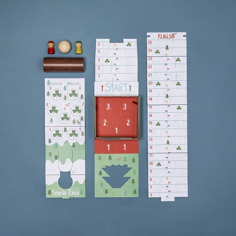 Un juego de carreras para 2 jugadores, a partir de 4 años. ¡El que llegue más rápido a la meta, gana la carrera! Un juego sostenible hecho de cartón y madera.