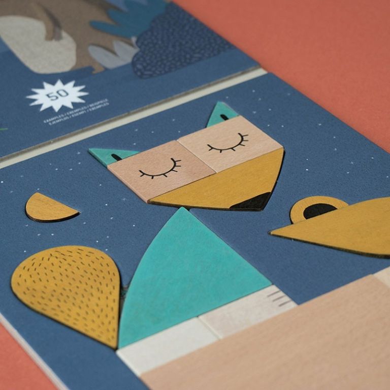 16 piezas de madera de colores nos abren paso a un mundo imaginario habitado por gatos y ballenas, búhos y zorros…