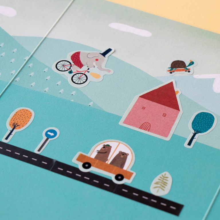 ¡Un juego con 150 pegatinas removibles de casas, coche, árboles, carreteras y señales de tráfico para que construyas la ciudad de tus sueños sobre tu escenario preferido!