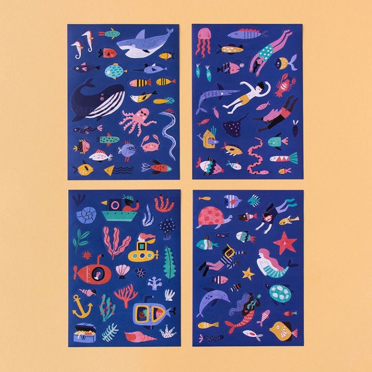 ¡Un juego de 150 pegatinas removibles marinas con algas, peces, sirenas y submarinistas para que construyas el fondo marino de tus sueños sobre tu escenario preferido!
