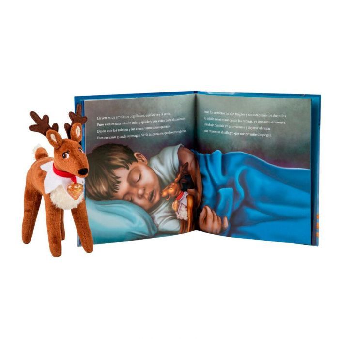 The Elf on the Shelf. Un libro de cuentos de tapa dura ilustrado, un muñeo Elf Pets Reno de peluche, un colgante de corazón de oro y un Certificado oficial de adopción. Los Elf Pets de Santa Claus son unos adorables animalitos enviados directamente desde el Polo Norte. Estas cariñosas mascotas se quedan todo el año con los niños que los adoptan, y se las puede abrazar, mimar y jugar con ellas. Cada Navidad, los Elf Pets ayudan a Santa Claus en todas sus tareas, y los niños que las tengan, también pueden colaborar en mandarle la magia que necesita para hacer volar su trineo y entregar los regalos a tiempo.